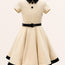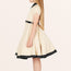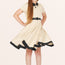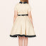 This lovely kids dress features a black collared neckline and skirt hemline. There are two decorative buttons on the front accompanied by a full circle flared skirt. The dress has a back centre zipper and black PU waist belt. In addition, the inside of this garment is fully lined giving you that extra comfort without compromising the look.